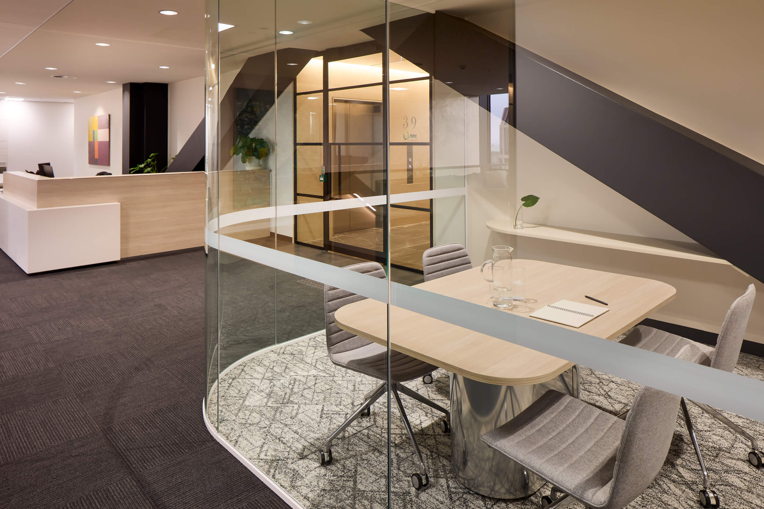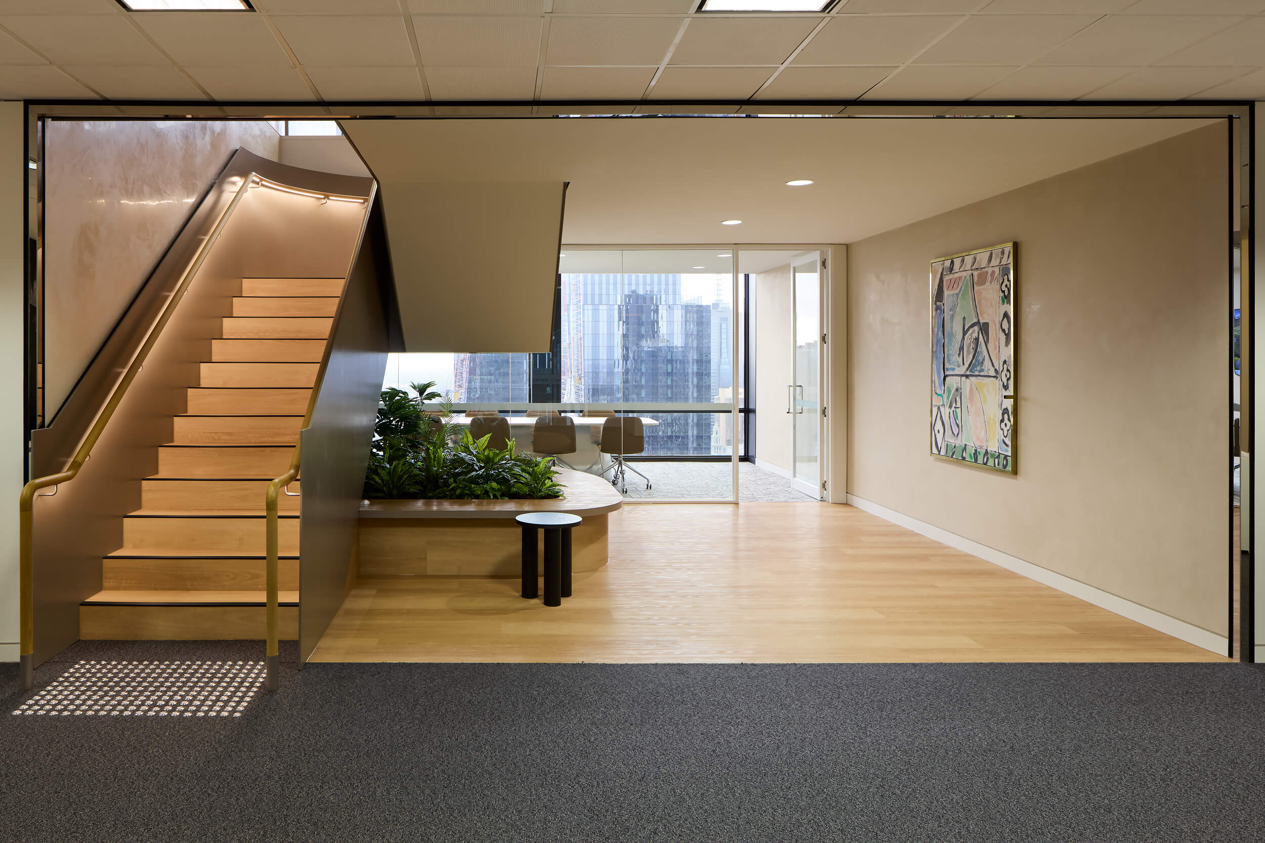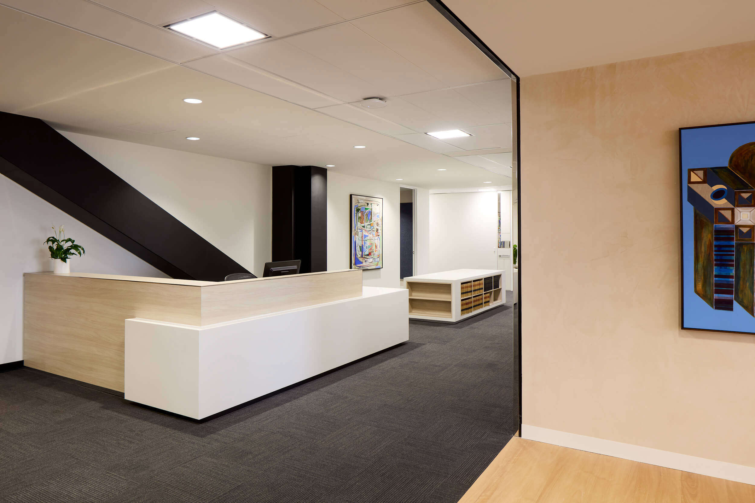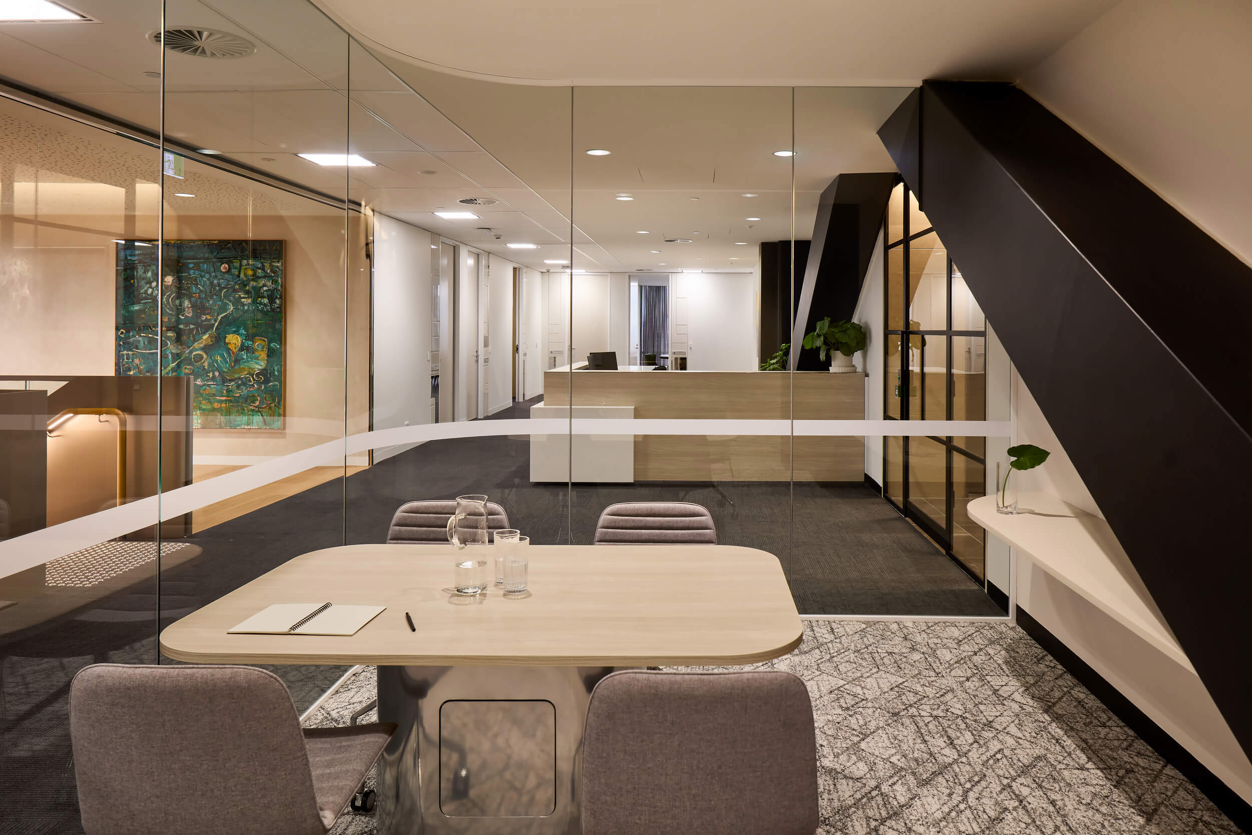 Crest Interiors was engaged to design and deliver an integrated workplace across two levels that felt cohesive, connected and aligned with the high standards of the chambers. At the heart of this vision was a striking interconnecting staircase, introduced to create connectivity between the floors. More than a circulation point, the staircase became a bold statement piece, encouraging movement and interaction while uniting both levels physically and visually.