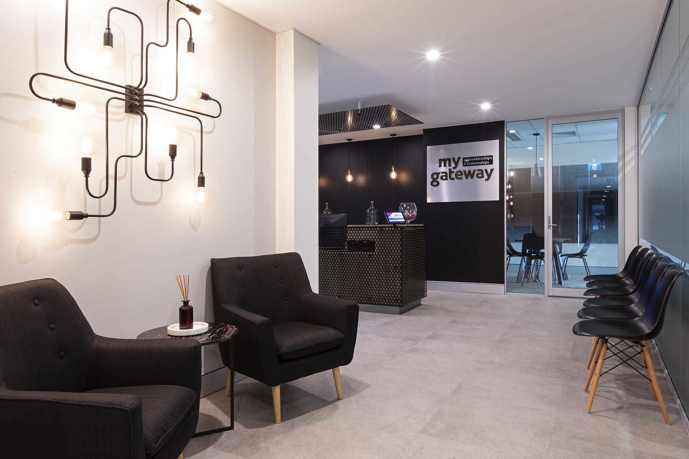 Working closely with the My Gateway team we developed a new design that complement’s their brand, using black fixtures, concrete look flooring and perforated metals. This is softened by timber elements, natural light and greenery.